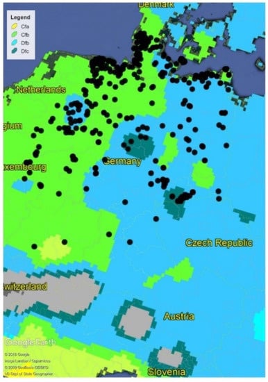 Figure 1 shows the wind turbine locations in Germany in the WMEP database that we use in this study. There are 427 wind turbines—4526 turbine years in Cfb region, 122 wind turbines—1346 turbine years in Dfb region, 25 wind turbines—306 turbine years in Dfc region in the WMEP database.