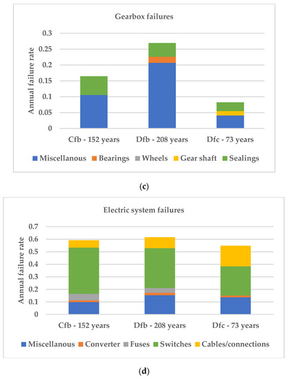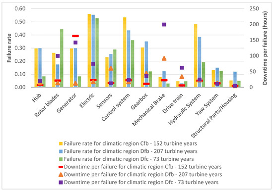 Figure 3 shows that annual failure rate per turbine values are at similar range in all climatic regions for subsystems except for hub, rotor blades, generator, gearbox and hydraulic system which happen in Dfc. Rotor blade failures have higher annual failure rates in Dfc than in the other climatic regions whereas hub, generator, gearbox and hydraulic system failures have lower failure rates in Dfc than in the others. Dfc, being a colder climatic region than the rest of the climatic regions in Germany, intuitively impacted on rotor blade failures however lower hub, generator and gearbox failure rates are counterintuitive. The distortion of the results in gearbox, generator and hub might be attributed to scarcity of data in the Dfc climatic region where there are only six wind turbines. For example, six turbines in Dfc region had no more than 0.23 annual failure rate in their gearboxes with two of them had no failures during their survey period, whereas eight in eighteen wind turbines having more than 0.23 annual failure rates in Dfb region six of them being more than 0.5. Figure 3 also demonstrates that the downtime per failure values tend to change depending on the climatic regions. Hub, control system, hydraulic system, yaw system, structures and housing subsystems show comparable results in different climatic regions. Rotor blades and electric system failures show significantly higher downtime per failure values in Dfc, whereas sensor failures have the highest downtime value in Dfb. This might be attributed to severe operational conditions in cold climates. Subsystems in Cfb region tend to have low downtime per failure—below 24 h except for generators.