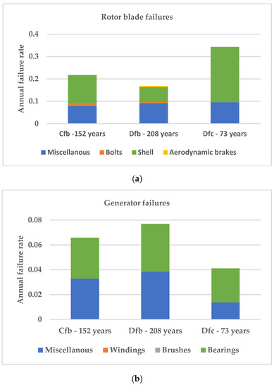 The most critical components in the generator subsystem are bearings as it can be seen in Figure 4. Wear is the only failure cause in all climatic regions. The significant effect of generator failures is noise, and this is observed in Cfb and Dfb.