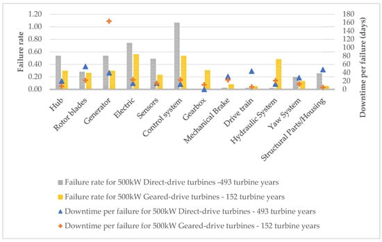 Figure 5 shows that annual failure rate per subsystem differs between direct-drive and geared-drive wind turbines. Hub, generator, sensors, control system, structural parts and housing subsystems have significantly higher annual failure rates in a 500 kW-direct-drive turbine than a 500 kW-geared-drive wind turbine whereas rotor blades, electric and yaw systems have slightly higher values in the same climatic region. Mechanical brakes and drive trains have slightly higher annual failure rates in the direct-drive turbines than geared-drive turbines, whereas hydraulic systems have a significantly higher value.