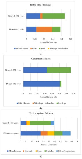 Distribution of failure rates in the components of the common critical subsystems which are mentioned in Table 3 in geared and direct-drive wind turbines. (a) Rotor blade failures (b) Generator failures (c) Electric system failures.