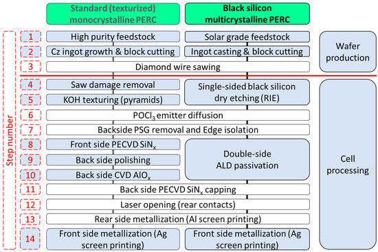 The main production process flow of standard texturized Cz-Si PERC PV devices is available in literature [38] and the steps are summarized in Figure 1 (left). The production steps of b-Si PERC PV devices are less commonly defined as they depend on the technology used for b-Si etching. In addition, in order to clarify the definition of black silicon considered in calculations used in this study, here black silicon will refer to a nanostructured silicon surface with <1% overall reflectance in the 400–1000 nm wavelength range for illumination under the AM1.5G conditions [39].