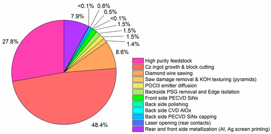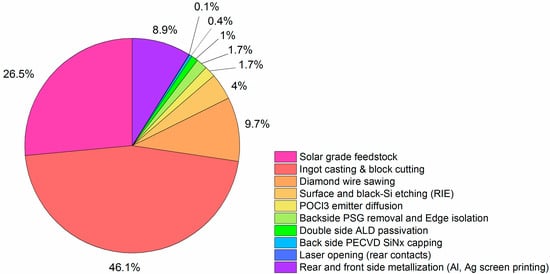 The relative costs for all the processing steps for the texturized Cz-Si and black mc-Si cells are shown in Figure 2 and Figure 3, respectively; where the costs are normalized over the total cost of the respective PERC process. Note that the majority of the costs are related to the costs of the substrates. In addition, the sum of the costs for the cell processing steps that differ between the two device architectures (i.e., corresponding to the process steps highlighted in blue in Figure 1) amounts to ~75% and 65% of the total cell costs for the Cz-Si PERC and the black mc-Si PERC, respectively.