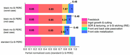 Figure 4 shows the sum of the normalized costs for the PERC process steps that are different between the reference and the black mc-Si PERC. Three cases are calculated for the black mc-Si PERC, corresponding to different costs for the b-Si DRIE step. The reference value (best case) is calculated considering the same step costs as for other b-Si etching methods currently deployed in industry, e.g., atmospheric dry etching (ADE). The remaining two scenarios, i.e., mid and worst scenarios, consider an increase in the etching cost by a factor of 2 and 3, respectively, due to the R&D effort required for the optimization of DRIE tools for industrial PV lines.