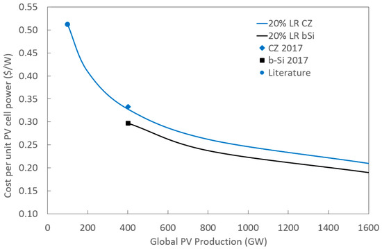 Figure 5 shows the cost per unit of solar photovoltaic cell power ($/W) as a function of global cumulative PV production in GW. The symbols in Figure 5 represent values from the literature extrapolated from [68] and the Cz and black mc-Si values calculated above. The line represents a 20% learning rate taken from the cumulative global PV production values of 100 GW surpassed in 2012 and 401.5 GW, which was obtained in 2017 [69]. The Cz value calculated here (two global PV manufacturing doublings) falls just above the expected 20% learning rate and offers a strong indication that the assumptions made in Section 2 are accurate. As can be seen in Figure 5, with the use of black mc-Si within two more doublings of global PV production the cost per watt of mc-Si cells is expected to drop below 20 cents per Watt. This results in PV-generated LCOE [10] electricity prices below those of all competing technologies by a large enough margin [11] that it can be safely estimated to vastly increase the overall PV market.