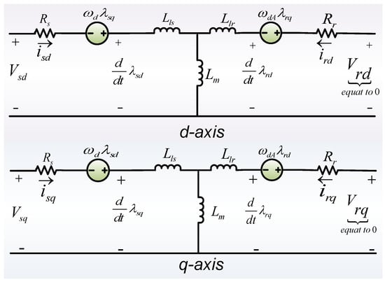 The stator and rotor model Equations (1)–(4), are combined to describe the dq equivalent circuits for the d-axis and q-axis in Figure 1.