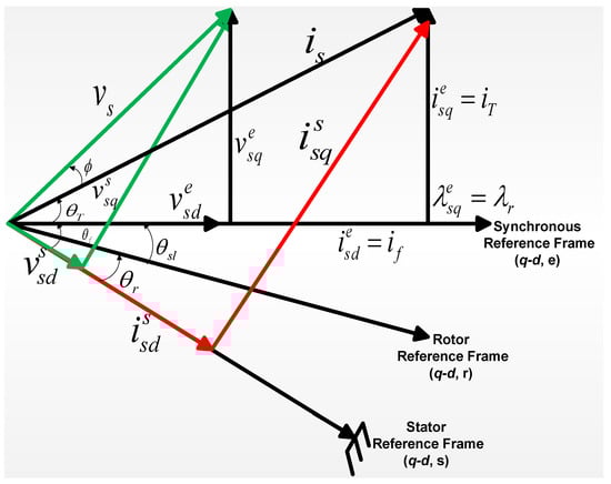 Equation (10), provides the reliance of on and is known as the dynamics equation of the d-axis rotor flux linkage. The is generated by the rotor d-axis flux, which is acting on the rotor q-axis winding, while the q-axis rotor flux is zero, established as: