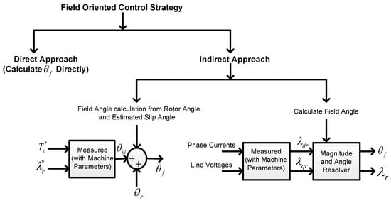 Field oriented control scheme on the basis of field angle acquisition is classified into two subcategories. If the field angle is determined by using Hall sensors or terminal currents and voltages or flux-sensing windings, then it is recognized as a Direct Field Oriented Control (DFOC) scheme. When the field angle is calculated by utilizing the position of the rotor and partial estimation with only machine parameters, without using additional variables, e.g., voltages and currents, it is called an IFOC scheme [24,25]. Figure 3 depicts the classification of Field Oriented Control Schemes (FOCS) for IM [9]. Furthermore, this research is based on estimated field angle.