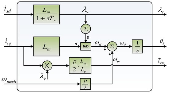 Figure 4 depicts, the model of IM for field angle calculation, basically, this is the implementation of Equations (9)–(11). The flux linkage of the rotor is aligned with the d-axis. The rotor flux , field angle and electromagnetic torque can be obtained from , and as inputs.