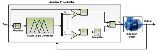where the controller input is , output of the controller is , and and are proportional and integral gains, respectively. Figure 6 demonstrates the adaptive fuzzy PI control scheme for the IFOC IM drive system. The error is minimized by updating PI gains using fuzzy rules. The update equation for the designed controller is presented in Equation (14).