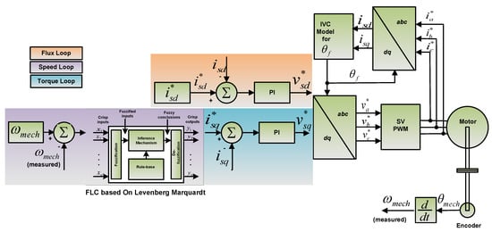 This segment describes the design of proposed FLC based on an LM algorithm. In the literature, different control schemes are implemented for IFOC IM drives, each approach has its own favorable characteristics [26]. FLC based on LM is the most appropriate for the non-linear, inadequately understood, and complex dynamic plants. FLC based on LM does not require an exact mathematical model and is known as a direct adaptive control procedure. IM can be optimally controlled by FLC based on the LM technique [27]. The knowledge base modifier handles the uncertainty of a non-linear model, while the updating of the singleton Membership Function (MF) makes the controller adaptive.