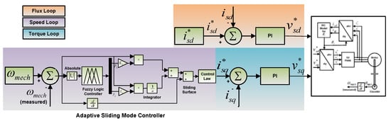 Figure 5 depicts the block diagram of the indirect VC scheme (VCS) or IFOC IM based on the proposed controllers. The machine drive applies indirect FOCS to IM, while the switches of the inverter are operated by the SVPWM technique. The calculated values of , , and and the designated value of are used to generate reference voltages ( and ) from dq-axis currents ( and ) for SVPWM. The reference values of , , and for the three phase voltages are measured using . The power electronics converter is based on SVPWM switching technique to deliver real stator voltages , , and [25].