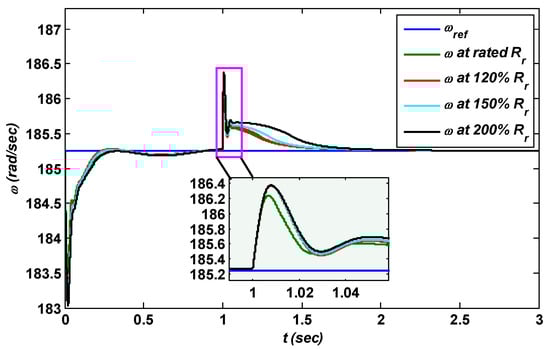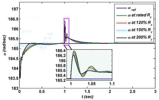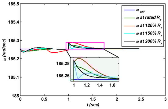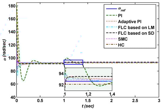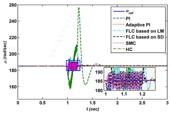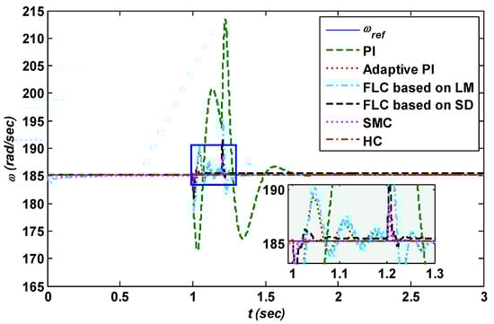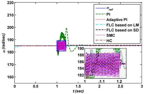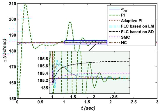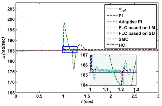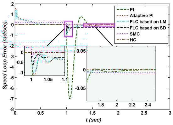 The robustness of the designed control schemes were successfully validated for low speed variation and the results are shown in Figure 21. The speed was reduced to half (92.62 rad/s) along with load disturbance at s. The non-minimum phase behavior of the PI controller produced an overshoot of 7.06 rad/s and undershoot of 25.625 rad/s. The speed settled slowly after s. Furthermore, the simulation results confirm slow convergence, high transient oscillation, and high SSE of the PI control strategy. The responses of adaptive PI, FLC based on LM, FLC based on SD, and SMC were almost the same with settling time of s, average overshoot of 3.05 rad/s, and undershoot of 3.15 rad/s. The chattering phenomena in the SMC resulted in large oscillations. Moreover, HC strategies provided an overshoot of 0.04 rad/s that settled at s and 0.08 rad/s undershoot with negligible oscillation. The tracking error for the dynamic response of the speed loop is presented in Figure 22. Among the designed controllers, the PI control strategy showed sensitivity, large slow convergence, and oscillation to load variation. However, the FLC based on LM algorithm, FLC based on SD technique, SMC, and HC (Adaptive Sliding Mode Controller (ASMC)) provided allowable sensitivity, less oscillation, and fast convergence when compared to PI.