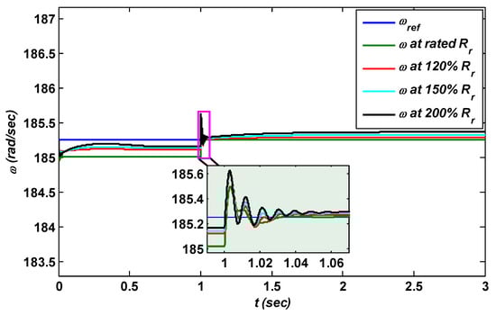The step-change in parameters generated the worst-case scenario for the motor under IFOC. The variation in the parameters was as follows: rotor resistance was 200% of rated value, mutual inductance was 80% of rated value, inertia to was 130% of rated value, was 50% of rated value, was 120% of rated value, stator inductance was 80% of rated value, and rotor inductance was 90% of rated value, at time as presented in Figure 23. In comparison to traditionally tuned PI controllers, the FLC based on LM, FLC based on SD, SMC, and HC provide smooth, robust, permissible overshoot with faster response, rise time, and settling time for the parameter uncertainties and load disturbances as presented in Figure 23.