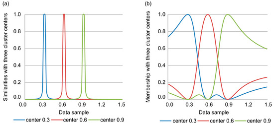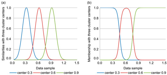 Fuzzy c-means (FCM) clustering algorithm for one-dimensional data: (a) similarity and (b) membership functions.