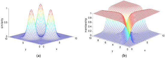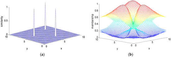 Two-dimensional dataset with three centers (traditional FCM): (a) similarity function; (b) membership function.