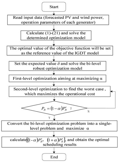 The flow diagram of the proposed IGDT-based spinning reserve optimization model that aims at maximizing the allowance of renewable energy system uncertainty under the preset system operational cost is shown in Figure 1.