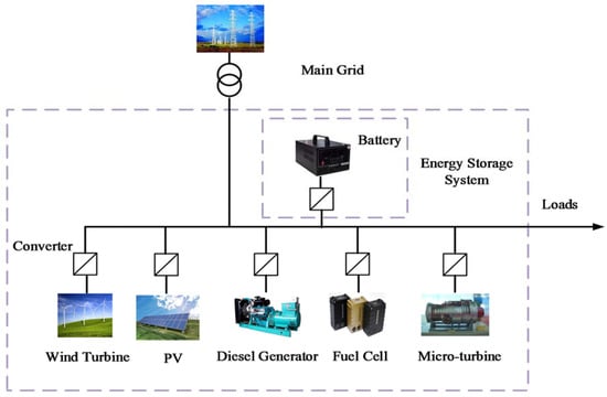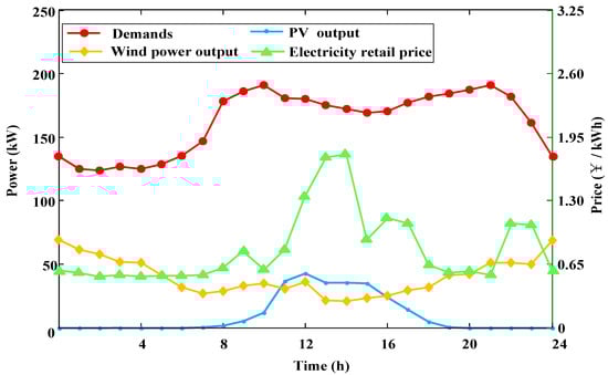 In this paper, a grid-connected microgrid system with local renewable energy generators installed is used as an example to verify the efficacy of the proposed IGDT-based spinning reserve optimization model. Figure 2 is the main structure of the grid-connected microsystem, and the rated parameters of local generators are listed in the Table 1. In addition, a 100 kWh battery is installed in this distributed system, whose maximum charging/discharging power is 50 kW. To extend battery lifespan, the minimum and maximum battery SOCs are set as 25% and 95%, respectively [24]. Finally, the predicted outputs of the PV panels, wind turbines, local demands, and real-time electricity prices are shown in Figure 3 to indicate the power supply–consumption pattern of the proposed system.