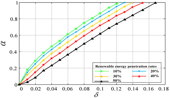 5.1. The Relationship between α and δ for Different Renewable Energy Penetration Rates