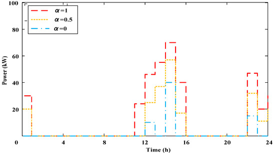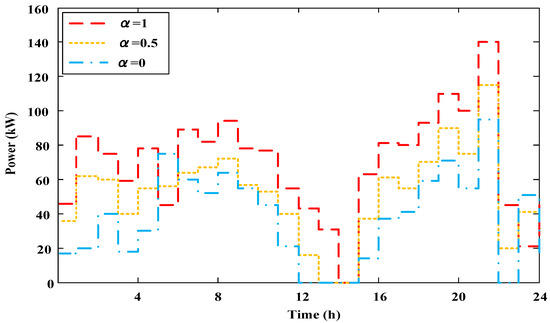 As can be seen from Figure 5 and Figure 6, with the increase of the MAoSU, the system needs to equip more spinning reserve capacity in order to maintain system reliability operation. In Figure 5, when α equals to 1, the maximum capacity of system up-spinning reserve is about 140 kW, which is about 93.3% of the total renewable energy installation capacity. While, when α reduces to 0.5 and 0, the maximum capacity of the system up-spinning reserve reduces to about 115 kW and 95 kW, which is about 76.7% and 63.3% of total renewable energy installation capacity, respectively. The optimization results prove that the installed up-spinning reserve capacity not only needs to compensate for the renewable energy fluctuation, it also needs to prepare for the variations in the electricity price and the interruptible loads. Meanwhile, by implementing the chance-constrained programming method proposed by Liu et al. [25], the optimal up-spinning reserve capacities of the proposed system are 85 kW, 95 kW, and 127 kW when α equals to 0, 0.5, and 1, respectively. It is easy to find that the optimal up-spinning reserve capacity is lower if the chance-constrained programming method is selected to optimize the system’s up-spinning reserve capacity. This is because the chance-constrained programming method tries to use the probability distribution function to model system uncertainty, and this method is inaccurate when it is used for a system with a high renewable energy penetration rate. Similar results are shown in Figure 6.