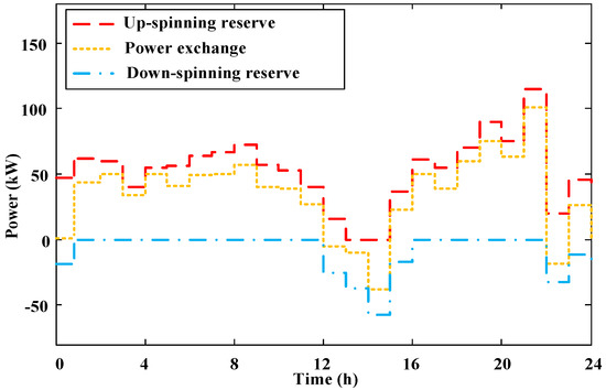 Additionally, the power exchange between the main grid and the distributed grid reaches its maximum value between 18:00–21:00, because for a distributed system, it is preferable to import cheaper electricity at a lower price time in order to reduce system operational costs. In this circumstance, the system needs to prepare more up-spinning reserve capacity. Similarly, between 12:00–14:00, the distributed system needs to export a large amount of electrical power in order to increase the system benefits, and in this situation, the system needs to equip more down-spinning reserve capacity.