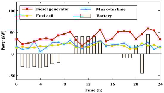 As shown in Figure 8, even though the system’s local demands are relatively low between 01:00–7:00, the energy generated locally cannot meet the electrical demand at this time. Therefore, the system needs to import energy from the main grid in order to supply electrical loads. Additionally, considering that the electricity price is relatively low at this time, the battery system is charged at this time. However, between 10:00–13:00, with the rapid increase of network loads and retail electricity price, the battery system should be discharged in order to compensate for the system energy shortage, and meanwhile, the battery system can obtain a substantial gain by exporting electricity to the main grid. It is worth noting that the battery system is discharged at 22:00, because by the end of day, the battery capacity should be discharged to its initial value for sustainable system operation. Finally, by comparing Figure 8 with Figure 3, it can be seen that the outputs of fossil generators are greatly affected by the renewable energy generation and local demands, but are less sensitive to electricity retail price factor.