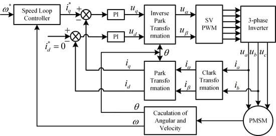 The field oriented control (FOC) diagram of permanent magnet synchronous motor (PMSM) system by id = 0 control approach.