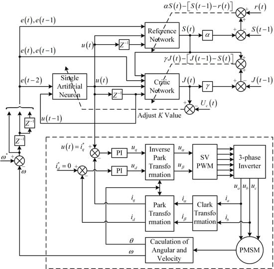 The detailed learning and adaptation are shown in Equations (27)–(33).The selection of K value is used to promote the rapid convergence of the value. The appropriate K value is selected and applied to the SAN (action network), and the optimal control value is output to vector control system of PMSM directly. The detailed calculating process is shown in Equations (23)–(26). The SAN-GrHDP optimal control output signal is q-axis current reference value of vector control system of PMSM. The weights of the reference network and critic network in SAN-GrHDP approach are initialized randomly. For comparative studies, the parameters of SAN approach are set the same as the SAN-GrHDP approach.