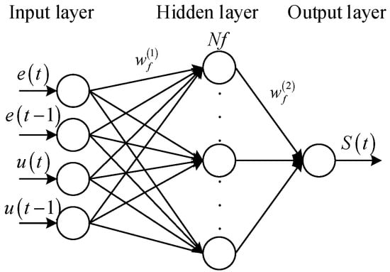where is the input vector of the reference network whose number is 4, including error value at time t, error value at time t − 1, action value at time t, and action value at time t − 1. is the ith hidden node input of the reference network. is the corresponding output of the hidden node. Nf is the total number of the hidden nodes. is the output of the reference network.