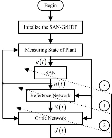 In the field of oriented control system of PMSM, speed difference is usually chosen as the input signal for the speed controller. In this SAN-GrHDP controller, previous control output is usually used as a supplementary signal input of the controller, so the controller input is of error value at time t, error value at time t − 1, error value at time t − 2, previous control output value , and the controller output is . The optimization parameters of controller will be updated accordingly by online learning. The data flowchart is shown in Figure 6 and the algorithm training process is described as follows:
