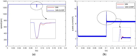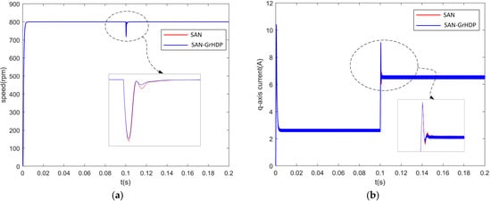To compare the disturbance rejection performance of both approaches, the comparative simulation of the proposed SAN-GrHDP control approach and the traditional SAN control approach are implemented on Simulink Matlab2016a (MathWorks, Natick, MA, USA). The parameters of the PMSM used in the simulation are listed in Table 2. The parameters of both current PI are the same: the proportional coefficient is 9, the integral coefficient is 3375. The saturation limit of the q-axis reference current is 10 A. The initial load of PMSM is 0.2 N·m.