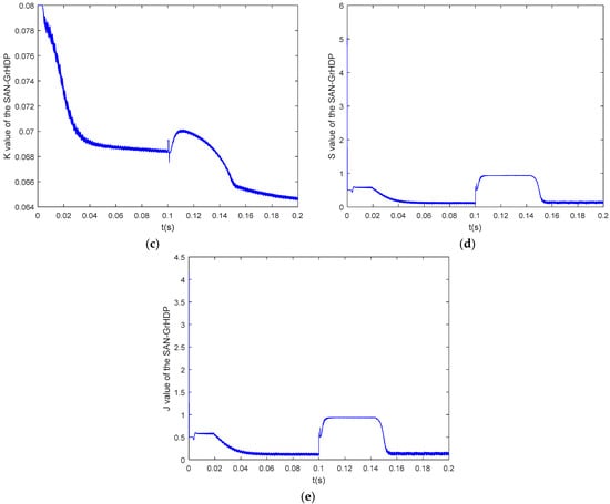 Simulation responses under SAN and SAN-GrHDP approaches in the presence of load torque disturbance at 800 rpm. (a) Speed. (b) . (c) K value of the SAN-GrHDP approach. (d) S value of the SAN-GrHDP approach. (e) J value of the SAN-GrHDP approach.