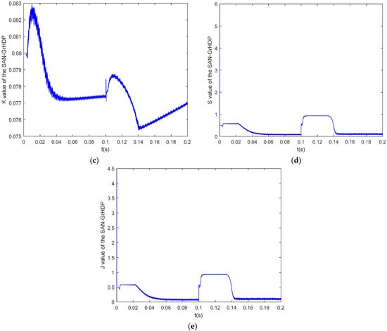 Simulation responses under SAN and SAN-GrHDP approaches in the presence of load torque disturbance at 1300 rpm. (a) Speed. (b) . (c) K value of the SAN-GrHDP approach. (d) S value of the SAN-GrHDP approach. (e) J value of the SAN-GrHDP approach.