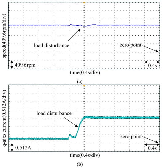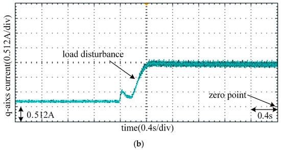 Figure 7b shows that the q-axis current response under SAN and SAN-GrHDP approaches in the presence of load torque disturbance at 1300 rpm. It shows that the q-axis current is quite large at the moment of the start of PMSM. The is much less than 10 A, which is the saturation limit of the output. As the speed is steady, the actual q-axis current decreases down to reference q-axis current . It can also be seen that, when a load torque 0.5 N·m is applied at 0.1 s, the actual q-axis current of both approaches rise quickly under the sudden load disturbance impact. However, the SAN-GrHDP approach has less current fluctuation than the traditional SAN control approach. Figure 8b shows that the q-axis current response under SAN and SAN-GrHDP approaches in the presence of load torque disturbance at 800 rpm. It can be seen from the Figure 7b and Figure 8b, when the same load torque 0.5 N·m is added suddenly at different speed, the q-axis current response at 1300 rpm is same as 800 rpm.