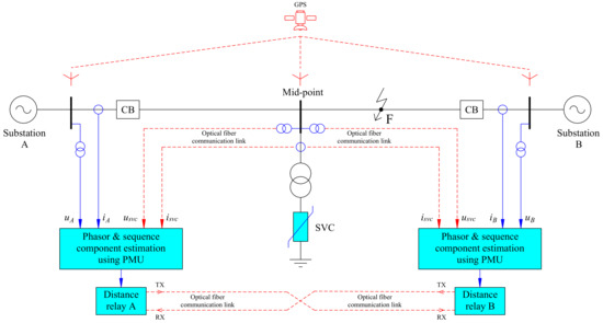 The one-line diagram of the study power system developed in this paper is shown in Figure 1. The system comprises a 220 kV transmission line with the length of 200 km and two substations connected to two ends of the line. In addition, a SVC is connected to the midpoint of the line. The current transformers (CTs) and voltage transformers (VTs) are placed at two ends and the midpoint of the line to measure currents and voltages at the locations. The feasible and simple method is proposed in this paper in which the currents and voltages are measured at the relay and SVC locations with the support of PMUs. Using high-speed optical fiber data communication, these signals are then transmitted to the relay location to calculate apparent impedance and locate the fault in the line.