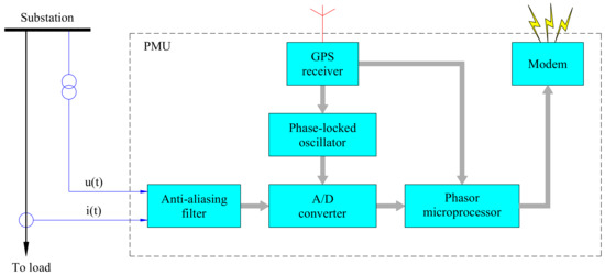 Schematic diagram of a phasor measurement unit (PMU) connected to the power system.