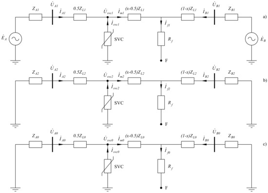 where , , and are positive, negative and zero sequence currents at the relay A, respectively; , , and are positive, negative and zero sequence currents at the SVC, respectively; , , and are positive, negative and zero sequence currents on the line segment between the SVC and the fault locations, respectively; , , and are positive, negative and zero sequence fault currents, respectively; , , and are positive, negative and zero sequence voltages at the relay A, respectively; , , and are positive, negative and zero sequence line impedance, respectively; is fault resistance; and x is the length of the segment from the relay A to the fault location in per unit. The phase-a voltage at the relay A is which can be determined from the sequence components as follows: