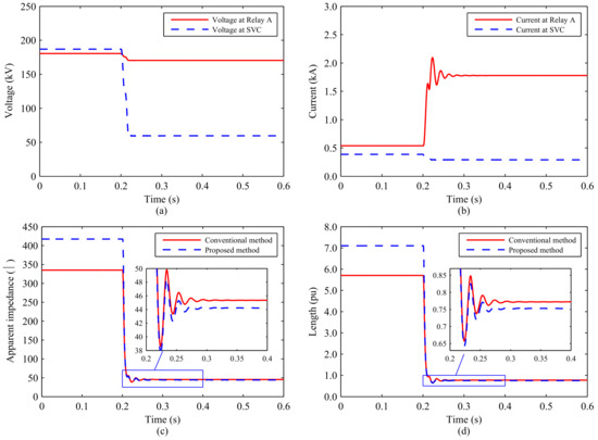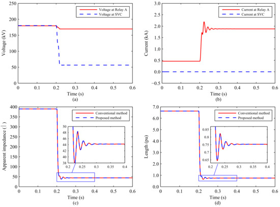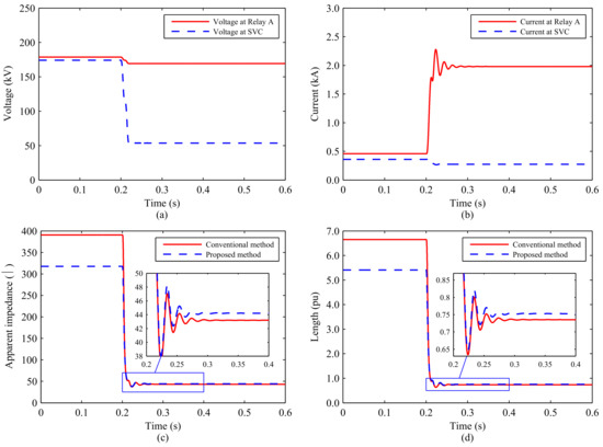 Figure 8 shows the simulation results of Case 3 “With SVC operating at −100 Mvar inductive mode”. At the period of time from 0 s to 0.2 s, the system is at steady state (pre-fault); therefore, all measurements in this period are also normal as shown in Figure 8a–d. It is clear that the simulation result in this period of Case 3 is also different from Case 1 and Case 2. The voltage at SVC location is lower than the voltage at the relay A as shown in Figure 8a because of the SVC operating at −100 Mvar inductive mode. Moreover, the current at SVC is about 400 A as shown in Figure 8b. The apparent impedance and fault location at the relay A in this period are shown in Figure 8c and Figure 8d, respectively.