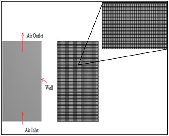The geometry dimensions for this work (0.22 m in height and 0.18 m in diameter) were borrowed from Ho [17] and constructed using ANSYS DesignModeler 17.1 (Ansys Inc., version 17.1, Canonsburg, PA, USA). The sago waste particles that were used as bed materials in the dryer had a height of 0.02283 m, which was calculated based on the density (1033 kg/m3) and mass (600 g) of sago waste in the experimental study.