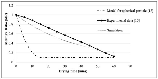 The model was validated by comparing the simulation results with the experimental findings of Ho (2016) [17] at an inlet air velocity of 1.30 m/s, inlet air temperature of 50 °C, and particle size of 2000 μm. The simulation results of this two-term exponential model were also compared with the simulation results of Zahir (2016) [20], as shown in Figure 2. Both the simulation and experimental data curve showed a diverse trend with the spherical particle data due to the different utilizations of the tool and model by the researcher. The simulation curve exhibited the same trend as the experimental data, thereby generating a minimal number of errors in the comparison. This simulation work also showed an improved prediction of the drying profile for sago waste compared to the simulation work performed by Zahir using a model of spherical particles.