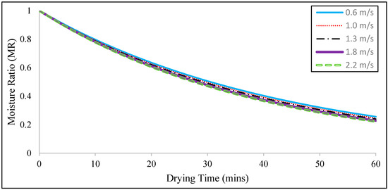 Figure 3 shows that the moisture ratio curve continuously decreases with time. Meanwhile, the drying time it takes to achieve a final moisture ratio of 0.25 decreases along with increasing air velocity. The shortest required drying time (56 min) is recorded at a peak velocity of 2.2 m/s but exceeds 1 h at a velocity of 0.6 m/s. This finding can be ascribed to the fact that a higher heat transfer rate is recorded at higher velocities. Specifically, the drying time reaches 59, 58, and 57 min at velocities of 1.0, 1.3, and 1.8 m/s, respectively. These results clearly indicate that velocity does not have any significant effect on the moisture ratio curve because the differences amongst the drying times recorded at velocities of 1.0, 1.3, 1.8, and 2.2 m/s are only 1 min at most. This finding may be attributed to the fact that the considered velocity range is not large enough to produce an obvious effect.