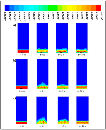 Figure 4 shows the solid volume fraction contour at different velocities. These contours exhibit the same trends across different bed heights in a simulation time range of 0 s to 10 s.