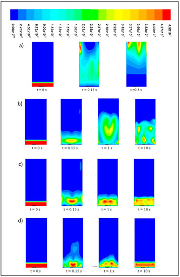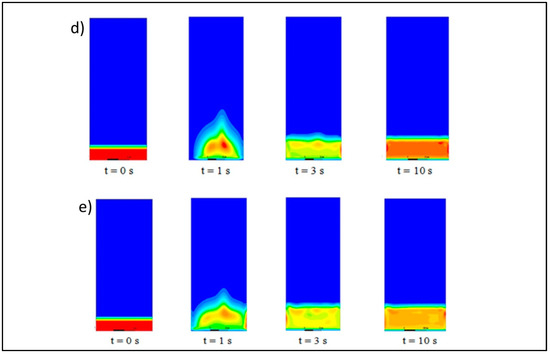 The effects of particle sizes 200, 500, 1000, and 2000 μm on the contour solid volume fraction are shown in Figure 6. These contours are divided into two phases, where the red color represents the solid phase with a volume fraction of 0.45, while the blue color represents the air phase with a volume fraction of 0. Sago has a density of 1033 kg/m3. Moreover, according to Geldart theory [22], those particles with sizes of 200, 500–1000, and 2000 μm are classified into groups A, B, and D, respectively. Particle group C with a size range of 10–20 μm was not included since it is not suitable to be used in FBD and shows poor fluidization [23].