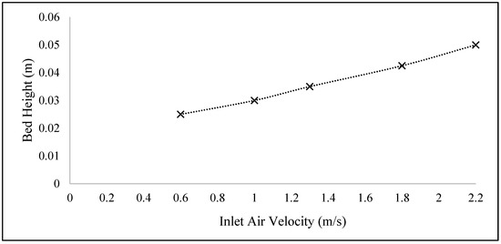 Figure 5 shows that the bed height reaches 0.025, 0.03, 0.035, 0.0425, and 0.05 m at velocities of 0.6, 1.0, 1.3, 1.8, and 2.2 m/s, respectively. At each velocity, the bed height slightly increases from its initial level of 0.00283 m because those particles with a size of 2000 μm cannot be easily fluidized according to Geldart theory.