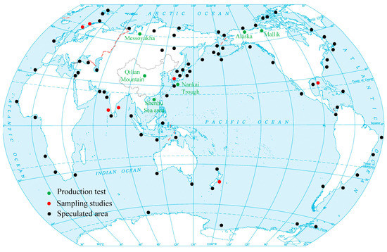 Distribution of NGH deposits on Earth [8]. (1) “Production test” represent the places where have been successfully tested NGH production; (2) “Sampling studies” represent the places just where the hydrate samples are taken but not production tested; (3) “Speculated area” represent the places where there may be hydrates under current prospecting technique.
