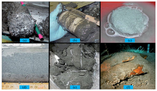 Occurrence characteristics of NGHs [6]. (a) Contained in the pore spaces of coarse-grained sand; (b) Massive lenses and nodules in muds; (c) Disseminated in muds; (d) Contained in the pore spaces of fine-grained marine sand; (e) Thin veins in muds; (f) Massive mounds on sea-floor.