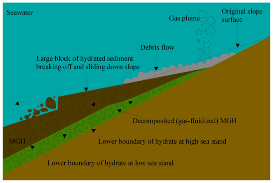 Submarine landslides are the most important type of marine geohazard that may be encountered during the development of MGH reserves. As the pressure-temperature conditions change during development of MGH reserves, methane is released, and the filling and cementation of the reservoirs is reduced [22,23]. This results in a decrease of effective stress and an increase in pore pressure, which reduces the shear strength and bearing capacity of the sediments and can lead to reduced slope stability (Figure 4). Geohazards, such as sediment deformation, slumping, and even debris flows may occur. The submarine landslides of Storrega (Norway), at Cape Fear (USA) and in the Beaufort Sea (Canada) may have been related to the decomposition of MGHs [24,25,26]. Three criteria for the potential occurrence of submarine landslide have been identified [26,27]: (1) hydrates are widely distributed within the landslide areas; (2) the initial position of the landslide zone must be located at the phase boundary of the pressure-temperature field, (3) there is a low-permeability deposit under the hydrates which can maintain high pore pressure. The criteria suggest that submarine landslides caused by MGH decomposition are more likely to appear on shallow submarine slopes.