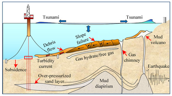 The development of MGH reserves may cause other geohazards (Figure 5), such as earthquakes, active faulting, mud diapirism, and turbidity currents. Rapid venting of MGH reservoirs may cause the development of active faults which could provide a further conduit for methane escape, which would lead to a further decrease of reservoir pressure and thereby increase the rate of methane production [28]. Once the reservoir is drained, secondary hazards such as earthquakes may occur as a result of sediment settlement into the produced voids. Mud diapirism caused by plastic sediment flow around over-pressurized sand layers may also occur [22,29,30].