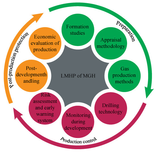 - Lifecycle management of potential hazards prevention in the exploitation of MGHs (LMHP) was proposed firstly. It has three stages: preparation, which involves investigating the accumulation mechanism, appraisal methodology and gas production methods; production control, which includes drilling techniques, monitoring during production risk assessment and early warning system; and post-production protection, including post-production remediation and economic evaluation of production. All these factors are inter-related and need to be systematically evaluated.
