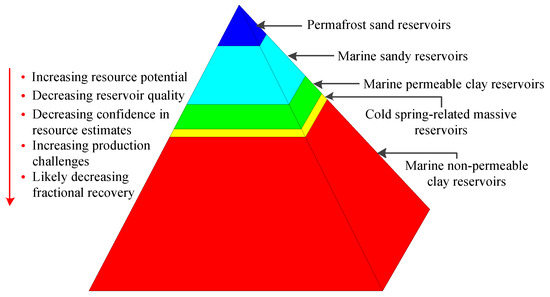 A comprehensive study of the formation, migration, accumulation, and storage of methane within the MGH, in conjunction with expected pressure-temperature conditions, gas source, gas migration, and the presence of suitable reservoirs within the MGH accumulation are the main factors to be determined [51]. The characteristics of each MGH accumulation depend on the interaction of all these factors [52]. The degree of difficulty for the development of NGH reservoirs can be represented in pyramidal form (Figure 10). The difficulty of developing MGH reservoirs varies in a continuum from low in sandy reservoirs, then permeable clay reservoirs, then cold spring-related massive reservoirs, to high in non-permeable clay reservoirs. Each reservoir-type can be subdivided into three types according to recoverable value: Class I, Class II and Class III [6,12]. Class I is that one hydrate bearing layer covers on a two-phase fluid zone with free gas which is considered to be the most suitable reservoir for natural gas production. Class II is that one hydrate bearing layer covers on a mobile water zone and Class III is that there is only one hydrate bearing layer, which are still not well defined as gas production targets [53]. The successful production test of high-saturation diffusion-sourced hydrates in a viscous siltstone reservoir in the Shenhu area of the South China Sea demonstrates that production can be successfully obtained from complex MGH reservoirs [54].